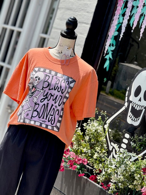 - Bring some spooky fun to your wardrobe with the "Bless Your Bones" design, featuring a quirky hand-drawn style.